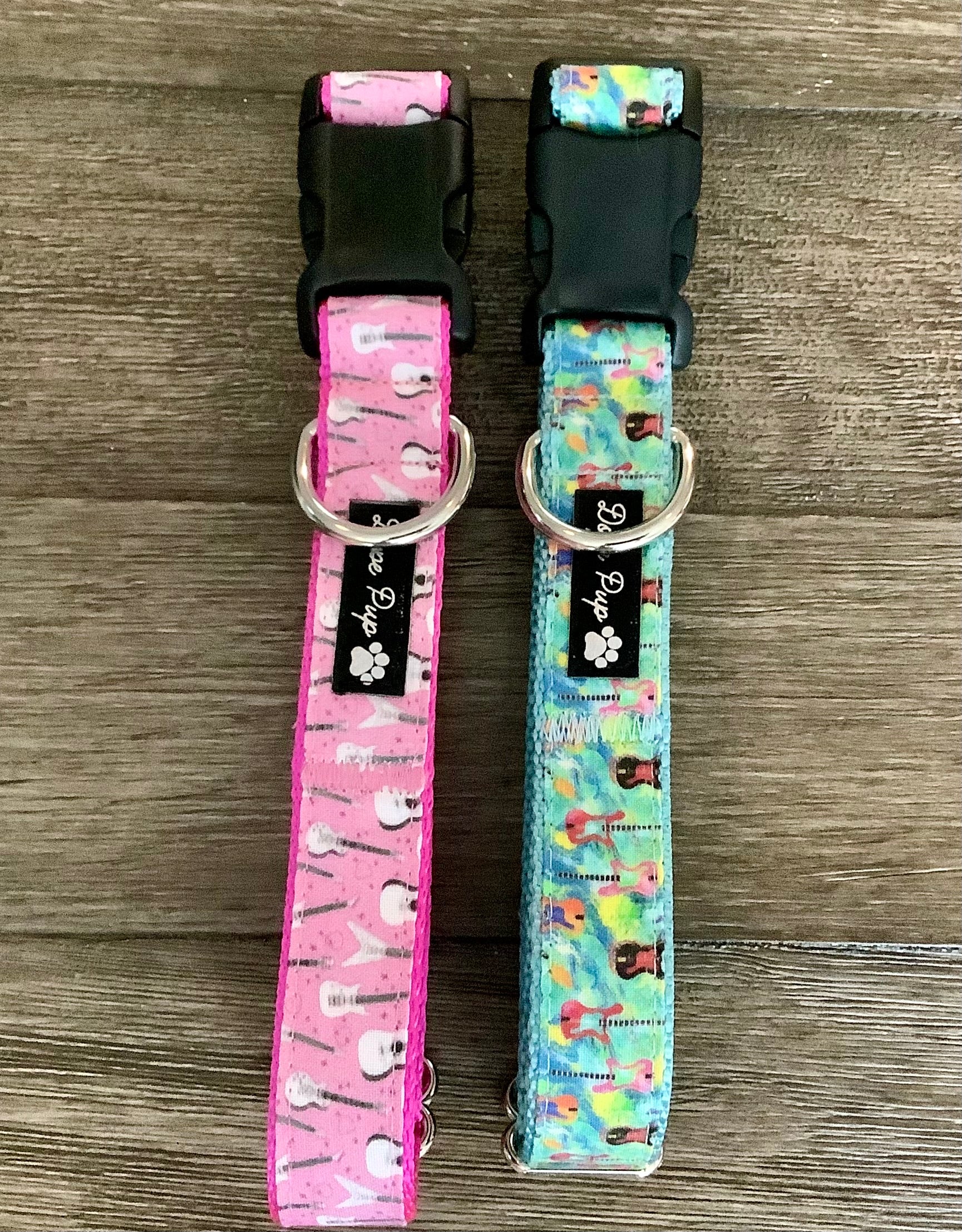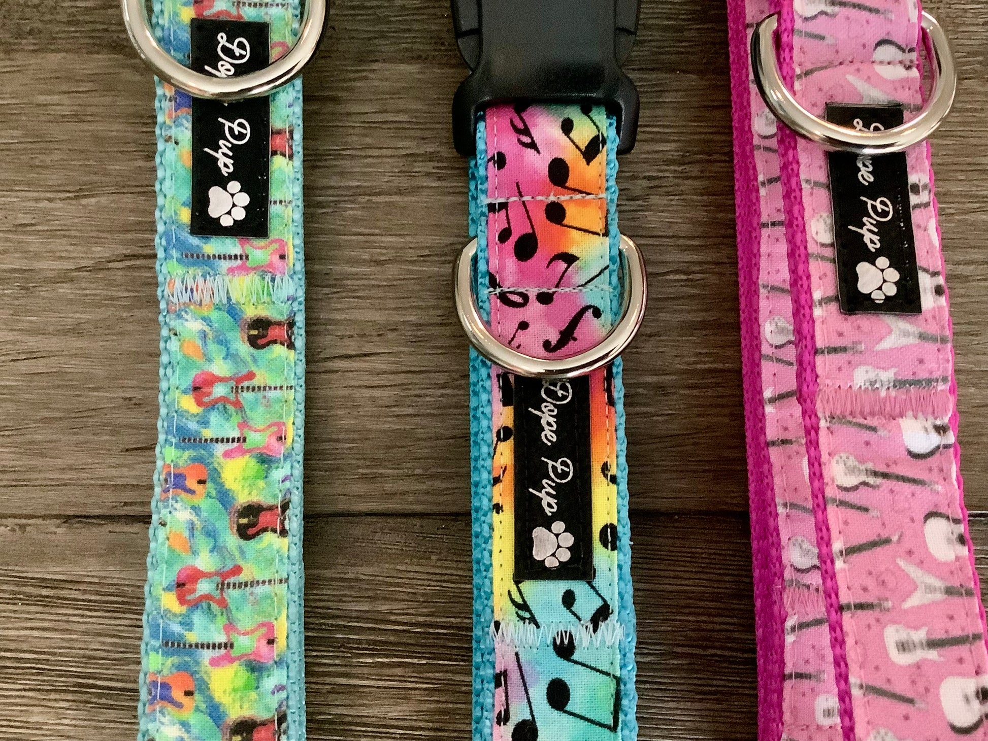 Turn up the fun with this aqua blue dog collar featuring a groovy guitar print. Perfect for your musical pup or as a unique gift for the musicians in your life. Great for the male or female pup. Made with high-quality hardware and heavy-duty USA-made webbing. This collar is available in sizes S to XL with your choice of plastic or metal buckle. Rock on!