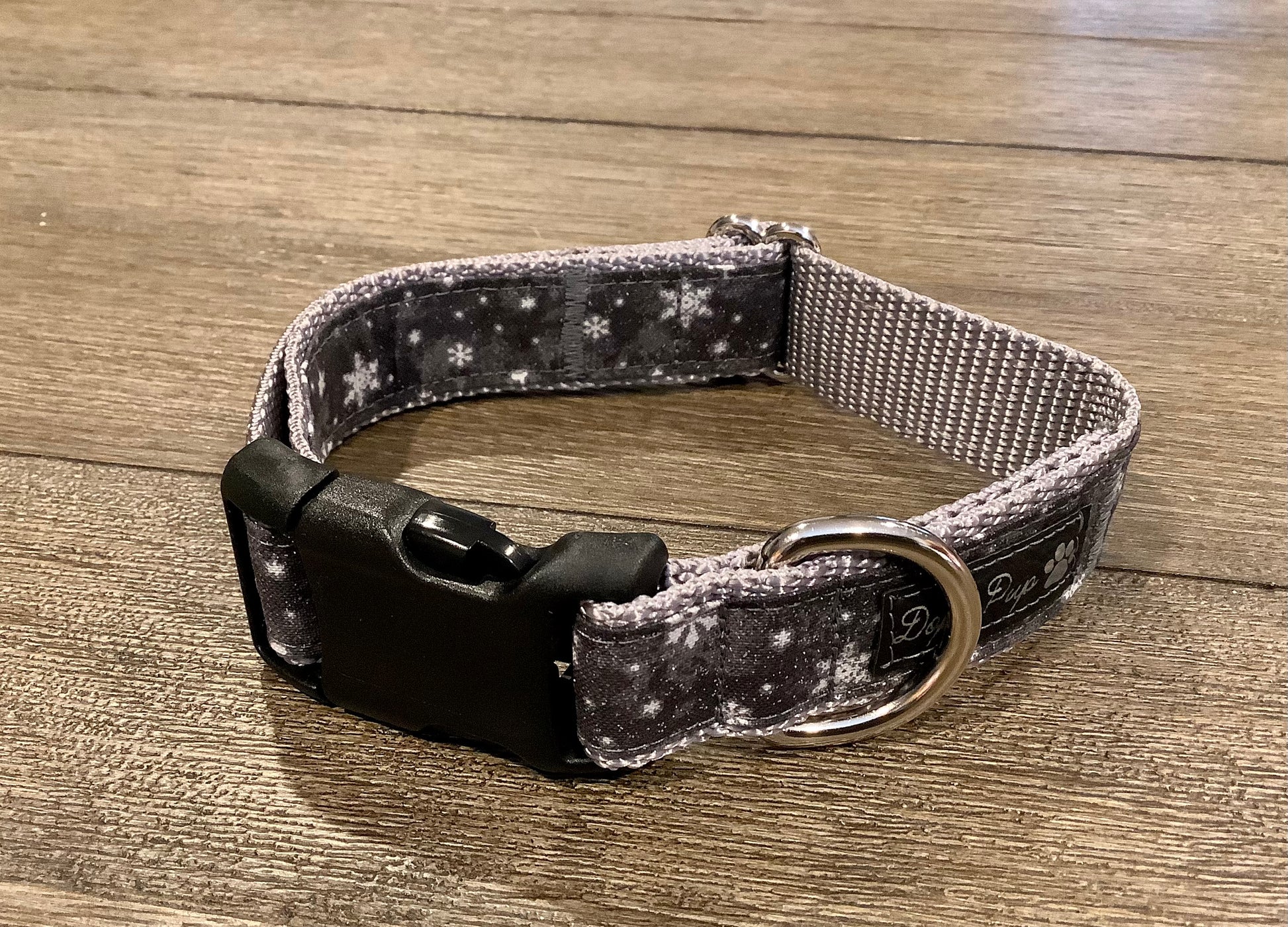 Get ready to dress your furry friend in style with our Elegant Winter dog collar! Featuring a black background with white & silvery snowflakes. This collar is perfect for both male and female dogs. Made with heavy duty silver webbing and your choice of plastic or metal buckle. It comes in a variety of sizes and widths to give your pup the perfect fit. Perfect for the holiday season or all winter long! If you choose to add a small 3” flower or bow, it will match your collar. If you choose to add a small 3" flower, it will match your collar.