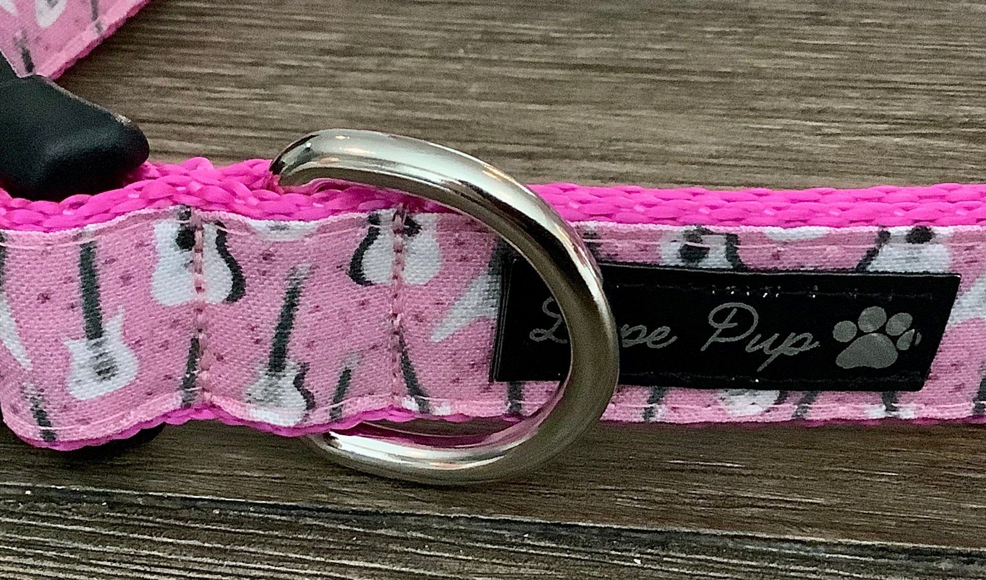 Turn up the fun with this pink dog collar featuring a groovy guitar print. Perfect for your musical pup or as a unique gift for the musicians in your life. Made with high-quality hardware and heavy-duty USA-made webbing. This collar is available in sizes S to XL with your choice of plastic or metal buckle. Rock on!